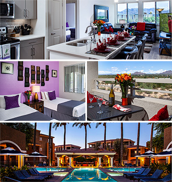 Each condo features a spacious living room, dining room, fully equipped gourmet kitchen, a washer/dryer and much more. Enjoy resort style pools, whirlpools, BBQ”s, state-of-the-art fitness center and 5 star service.
